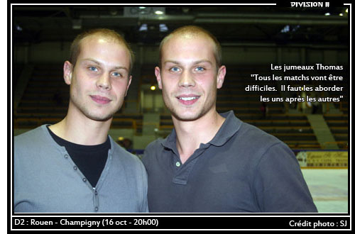 Quoiqu'il en soit, les deux seront bien présents pour soutenir cette équipe rouennaise face à Champigny, équipe aléatoire capable de se faire fesser à Annecy (20-1) avant de rebondir sur une victoire à domicile face à Clermont (5-4) après avoir enregistré l'arrivée de l'ex-joueur de Viry et Courbevoie, Zdenko Sarnovsky. Méfiance de rigueur pour les Dragons à l'image du discours tenu par les jumeaux « Il faut confirmer face à une équipe sensée être plus faible que celle de Wasquehal en conversant le même rythme » annonce Julien qui trouve en écho son alter ego tout aussi méfiant « Il ne faut jamais sous-estimer l'adversaire »