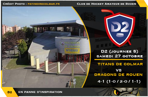 Restés sur une probante victoire en prolongation à domicile face aux Diables Rouges de Valenciennes, les Normands avaient dans la tête de poursuivre leur série de deux victoires consécutives. Dans l'inconnu face à une équipe qu'ils n'avaient jamais croisé, les Rouennais ne parviendront pas à prendre le dessus sur des colmariens précis et opportunistes en avantage numérique au contraire des Dragons. La statistique fait mal dans le camp jaune et noir et illustre parfaitement l'impossible des rouennais de prendre des points avec un tel pourcentage d'inefficacité en avantage numérique. En sept tentatives sur l'ensemble de la rencontre, les unités spéciales rouennais ne parviendront à en convertir aucune. Beaucoup trop juste pour espérer s'imposer d'autant plus que les Titans alsaciens se montreront décisifs dans ce secteur avec un premier but en avantage numérique converti par Michal Macko dès leur première tentative (19'11)