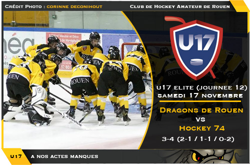 Alors qu'à plusieurs reprises, ils auront eu l'occasion de « tuer définitivement » la rencontre, les U17 rouennais s'inclinent 3-4 à domicile face à Hockey 74, abandonnant au passage quelques illusions et quelques espoirs de terminer à la deuxième place du classement de la poule A.