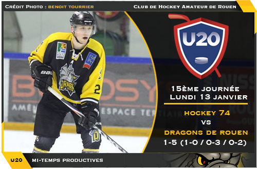 Déjà très en verve en début de rencontre avec un but et une passe, impatient, le défenseur Mathieu Mony n'attendait pas la fin de la première minute de jeu de la deuxième mi-temps pour alourdir un peu plus le score (40'45) Dépassé, Hockey 74 ne pouvait que constater les dégâts alors que quelques secondes plus tard en avantage numérique Antonin Germond fixait la mise à 5-1 (42'01) Incapables de réagir y compris sur un double avantage numérique (47'52), les joueurs de Hockey 74 subissaient jusqu'alors les évènements sans jamais avoir laissé entrevoir la moindre velléité de révolte sur la banquise jaune et noir. Et lorsque la table de marque annonçait les deux dernières minutes de jeu dans la rencontre, personne ne regrettait que le match arrive enfin à son terme après de longues minutes de lascive passivité. 5 buts à 1, les deux équipes s'en contenteront enfin surtout les Dragons nécessairement satisfaits d'enregistrer un nouveau succès avant la réception des Rapaces de Gap dimanche 20 janvier.