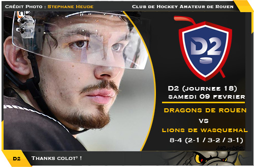 Résolument pour la D2 rouennaise, Noël sera désormais célébré le 09 février et le père Noël aura l'accent du nord tant les Diables Rouges de Valenciennes auront participé aux bonnes œuvres des Dragons en retournant le match face aux Titans. Pourtant menés 2-0 par les colmariens à la fin du premier tiers, la lanterne rouge de la poule finira par s'imposer 4 buts à 3 offrant une porte de sortie pour la quatrième place incroyable aux Dragons. Encore fallait-il que les rouennais soient en mesure de s'imposer à domicile face à d'autres nordistes, les Lions de Wasquehal, deuxièmes au classement. Et force est de constater que le scénario de début de rencontre allait dans le sens d'une dénouement incroyable pour la formation jaune et noir. Tentés régulièrement avec la plupart du temps un succès très relatif, cette fois tout au long du week-end de D2, les renforts de la Magnus, notamment celui de Fabien Colotti aura pesé lourd dans la balance jaune et noir.
