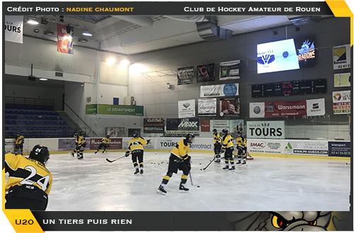 Alors que dans les rangs parisiens, on pouvait noter la présence de deux anciens dragons, Hugo Dumont et Axel Benet, c'est sur un sourire jaune et noir que la partie débutait après une dizaine de minutes sans but, les rouennais laissant échapper une belle opportunité en double avantage numérique (07'30) Quoiqu'il en soit sur une tentative de Léo Compignie, peu après la mi-match, la formation normande trouvait l'ouverture du score (13'57) dans une période plutôt équilibrée où le jeu s'était invité avec plaisir. Nettement moins équilibrées seront les cinq dernières minutes du tiers alors qu'en désavantage numérique, Hugo Dumont se chargeait de l'égalisation (14'34), deux minutes pile avant le deuxième but parisien, cette fois en avantage numérique, pour Killian Delobelle (16'34)