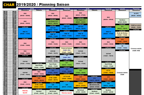 Si à l'heure actuelle, nous resterons prudent quant à la date exacte de reprise des entraînements pour la saison 2019-2020, aucune information officielle nous ayant été à ce jour communiquer, en revanche, les horaires d'entraînement glace & hors-glace sont d'ores et déjà affectés, vous trouverez ci-dessous les créneaux prévus pour chaque catégorie.