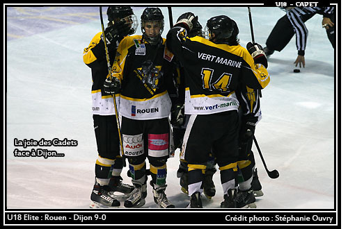 Malheureusement pour Jonathan Paredes et son équipe, la troisième période se révèlera être un long chemin de souffrance. Ne méritant sans doute pas pareil revers, les dijonnais subiront tout de même le courroux rouennais. Sur un lancer de Téo Laurent qui ne touchait pas cible, Maxime Griet s'en allait récupérer dans le coin le palet avant de servir Victor Houeix pour le 3-0 (41'40) Dès lors, plus rien n'allait dans le coin des Ducs et les Dragons déroulaient à l'image de Johan Saint-André au lancer de « mammouth » en lucarne (43'55) ou encore Robin Lambart, à l'affût pour son anniversaire qu'il fêtait dignement d'un but ;o) (45'16) En quelques minutes, le tableau d'affichage s'affolait et les buts s'enchaînaient. Johan Saint-André à nouveau par deux fois (46'16 & 50'29), Mathieu Briand (49'14) et Florian Duval (56'59) complétaient la liste des buteurs rouennais avec enthousiasme et couleur. Désormais relégués à 9-0, les Dijonnais ne pouvaient plus guère espérer grand chose et avaient sans doute hâte que le match ne se termine alors que l'ancien rouennais Ronan Guegot goûtait avec délicatesse à quelques épaules rouennaises bien amicales ;o) Fin du match sur le score de 9 à 0 pour les Dragons qui décrochait ce qu'ils souhaitaient : la victoire avant de retrouver la semaine prochaine ces mêmes Ducs, cette fois sur leurs terres.