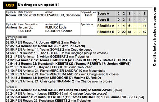 Toujours savoureux, toujours valeureux, difficile de se lasser de ces duels entre les éternels rivaux quelque soit la catégorie, et là encore, pour les Dragons, il était question d'honneur et de suprématie au moment d'aborder cette rencontre. Faisant fi des résultats calamiteux amiénois, une victoire pour douze défaites depuis le début de la saison, les rouennais abordaient cette rencontre comme une finale et faisait rapidement plier leurs adversaires. Après une longue séquence où le trio Pelletreau – Hervé – Leborgne faisait merveille devant la cage amiénoise mettant une pression folle sur la défense rouge et noir avec une belle occasion à mettre au crédit de Charles Pelletreau, sur l'engagement consécutif, Théo Guerif remportait pour lui-même le face-off avant de tenter la passe devant la cage qui sera déviée au fond de ses propres filets par l'une des tours défensives picardes (05'15) Bien lancée, la première période rouennaise se révèlera être rentable comptablement. A ce premier but marqué dans les cinq premières minutes de la rencontre, en écho, on trouvera un deuxième inscrit dans les dernières secondes, cette fois en situation de supériorité numérique, par l'inénarrable Arthur Zavani (19'37)