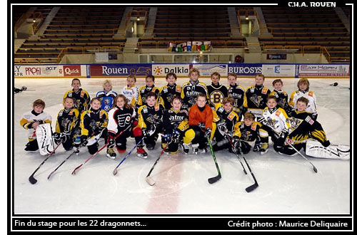 Nos 22 petits Dragons viennent de terminer leur semaine de stage avec pleins de souvenirs dans leurs têtes... tant techniques comme les nouveaux exercices sur glace sous la conduite de Peter, Nordine, Kévin et Alexandre que ludiques avec ces applications hors glace organisées par Thomas le préparateur physique du Club ; et sans omettre tout ce qui est autour de ces 2 activités principales, de la mise en tenue au comportement en groupe hors milieu scolaire et parental où tout le monde a été très agréablement surpris de la capacité d’autonomie dont a fait preuve les plus jeunes d’entre eux...