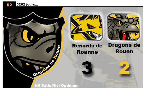 En dix-huit confrontations en play-offs dans son histoire, Rouen en Division 2 n'avait été jusqu'alors capable de remporter que deux rencontres pour un match nul et quinze défaites. Alors que le dernier succès en play-offs des Dragons remontait au 12 mars 2011 et une victoire homérique 6-5 à Amnéville, pour sa dixième saison en D2, les rouennais n'étaient plus qu'à vingt minutes de mettre fin à une disette de presque neuf années. 3262 jours, une éternité que les dragons étaient à deux doigts de réduire à néant à condition de traverser le troisième tiers en évitant un maximum d'écueil comme sur cette première pénalité où Roanne trouvait la solution pour égaliser avant que l'arbitre ne vienne à la rescousse des rouennais en invalidant le but roannais. Avertissement sans frais pour les joueurs d'Ari Salo loin d'être en reste avec quelques opportunités de tuer tout suspense dans la partie. Malheureusement dans ce match particulièrement étriqué, c'est un natif de Rouen et ex-dragon qui viendra transpercer le cœur d'un Dragon si proche de son objectif. A dix minutes du terme de la rencontre, le désormais attaquant roannais, Thomas Saunier, en tête à tête avec le portier rouennais parvenait enfin à trouver la combinaison du coffre jaune et noir pour égaliser à 1-1 d'un lancer pleine lucarne. Partie totalement relancée pour le coup et ondée de prison en approche de part et d'autre avec notamment un cinq minutes infligé au renard Jean-François Houde (50'55) De quoi relancer la machine rouennaise qui à nouveau se présentait avec insistance devant la cage tenue par Clément Ginier. Alors que le « money time » s'enclenchait avec les cinq dernières minutes de la partie, plus que jamais l'incertitude était de mise. Alors que les rouennais trouvait le poteau à quelques minutes de la sirène finale, dans la foulée, Charles-Olivier Ouimet s'offrait un slalom géant sur la glace de la patinoire Fontalon pour porter l'estocade finale avec un cruel, terrible, déchirant, amer, douloureux deuxième but (57'34) Tandis que sur le banc rouennais, on réclamait le temps mort, l'épilogue de cette rencontre semblait toute proche... toute toute proche avec à la clef une cruelle déception pour les Dragons. Une perspective intolérable que Quentin Tomasino refusait en faisant chavirer de bonheur le banc rouennais en apportant l'égalisant aux Dragons à 46 secondes de la sirène finale. Scénario incroyable pour cette fin de rencontre qui embarquait, désormais, les deux équipes dans un chaloupé tango en prolongation. Du surtemps, il ne sera question que de quelques secondes, le temps pour Romain Bonnefond de crucifier les rouennais avec le but vainqueur (60'45) ... synonyme de défaite...