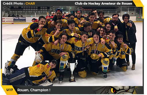 Rendez-vous donc à la patinoire de Toulouse-Blagnac pour les trois derniers matchs de la saison U17 Excellence. Face à Chambéry / Valence, Toulouse et Colmar Mulhouse, les Rouennais avaient à leur disposition trois rencontres pour tenter de conserver leur titre. Une première rencontre face à Mulhouse permettait aux Dragons de se placer sur une bonne dynamique. Emmenés par le duo Léo Compignie – Konstantin Kebets, auteur d'un doublé chacun, les rouennais ne tergiverseront guère longtemps avant de prendre l'ascendant dans la rencontre. Une victoire 7-2 bonne pour le moral qui permettait aux Dragons de préparer au mieux leur deuxième rendez-vous dès le lendemain face à l'association Chambéry / Valence. Alors que dans les autres rencontres de cette finale, les issues des parties aura été sujet à de nombreux rebondissements, du côté des Dragons, la stabilité restait de mise à commencer par le trio infernal Kebets – Compignie – Simonsen, chacun s'offrant un triplé face aux joueurs de Savoie. En prenant le parti de démarrer fort la rencontre avec cinq buts inscrits dans les dix premières minutes de jeu, les rouennais avaient contraint les chambériens à courir après le score. Une course échevelée au cours de laquelle ils perdront trop de force pour revenir au score laissant les Dragons s'imposer 12-4. Alors que plus tôt dans l'après-midi, Mulhouse avait pris le dessus sur Toulouse 9-2, dès le deuxième jour, les Rouennais étaient sacrés champions de France U17 Excellence pour la deuxième fois consécutive. De quoi rendre anecdotique pour les Dragons la dernière rencontre jouée et perdue face à Toulouse (7-8) qui ne changeait finalement rien pour les rouennais mais bouleversait ostensiblement le podium, Toulouse chapardant la deuxième place au nez et à la barbe des Mulhousiens, troisièmes et dindon de la farce jaune et noir.