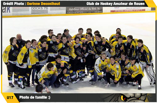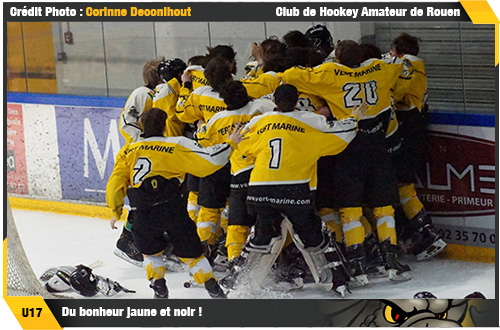 Et de fait, les craintes des rouennais avant la série finale se confirmait dès la première manche. Alors qu'un doublé d'Axel Tarabusi à cheval sur la pause du premier tiers donnait le ton, le troisième but de Charles Schmitt au début du troisième tiers semait l'effroi dans les rangs rouennais. Menés 0-3, les rois du suspense rouennais n'en avait pas fini avec cette partie. Réduisant le score une première fois par Arthur Papeil puis par Maxime Thomas, à cinq minutes de la fin du match en avantage numérique, Gabin Mainfray trouvait l'égalisation à 3-3. Moins de trois minutes plus tard, à trois minutes de la sirène finale, César Vial pour les Rapaces de Gap pensait bien offrir le but vainqueur aux siens en désavantage numérique. Que nenni ! C'était sans compter sur la folie douce des Rouennais qui égalisaient moins d'une minute plus tard en avantage numérique par Gabin Mainfray, décisif avec son doublé. 4-4 à la fin de la première manche (résumé) au terme d'un suspense insoutenable, cardiaques s'abstenir pour la deuxième et dernière manche avec nul doute une nouvelle rencontre totalement folklorique. A peine trois minutes échues, le défenseur rouennais Nicolas Plaquevent sortait son plus beau lancer pour ouvrir le score. Si dans la foulée, Mathis Roussin-Bouchard en avantage numérique également égalisait, là encore, c'est l'inattendu pilier défensif jaune et noir Nicolas Plaquevent qui donnait le 2-1 aux rouennais. Pour autant avant la première pause, Charles Schmitt trouvera l'égalisation à 2-2. Dans cette finale débridée, les quatre buts, deux de chaque coté, avaient tous été marqué par des défenseurs. Il était presque normal de donner le coup décisif à un défenseur. Sur un travail de charbonnier d'Arthur Zavani, Nicolas Plaquevent héritait en haut de la zone défensive gapençaise pour décaler pour le lancer à mi-hauteur de Charles Carabasse (47'41) Court moment d'extase dans le camp des Dragons. Sans le savoir, le dernier but de cette saison 2016-2017 venait d'être marqué ! Les gapençais, soldats glacés au cœur vaillant, tout autant méritant que les Dragons jèteront leurs dernières forces dans la bataille, encore et encore et encore. Mais rien n'y fera, Valentin Duquenne dira non, la défense jaune et noire fermera la maison jusqu'à l'apothéose de la saison avec cette sirène finale synonyme de titre de champion de France pour les Dragons (résumé) ! Le 7ème de l'histoire du club ! Une magnifique aventure que cette aventure U17 faite de hauts, de bas, de moments difficiles et de moments radieux comme cette scène de fin de saison qui restera longtemps, très longtemps gravée dans les mémoires des jeunes Dragons.