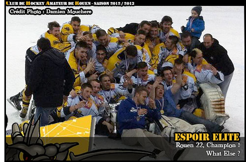 Depuis l'exploit de Grenoble en 2008-2009, quatrième en saison régulière avec d'être champion, aucune autre équipe n'était parvenue à réaliser une performance similaire, les deux derniers sacres ayant été octroyés au vainqueur de la saison régulière. Avec un Hockey 74 au-dessus du lot toute au long de la saison et une équipe d'Amiens particulièrement en verve sur les derniers matchs, les Dragons n'étaient pas nécessairement les mieux placés chez les pronostiqueurs au moment d'aborder la cruciale phase des play-offs. Dans l'histoire des play-offs espoir élite, rarement demi-finale n'aura été aussi intense que celle que vivront Amiens et Rouen. Déjà la saison précédente, Rouen avait connue une demi-finale épique face à Mont-Blanc mais une coche en plus sera franchie dans cette magistrale opposition digne d'une finale. Avec trois victoires dont deux en prolongation sur les quatre rencontres programmées, les Dragons avaient au moins l'avantage de l'antériorité face aux Gothiques d'Amiens. Maigre réconfort au moment de début une demi-finale dans l'auto-nommé « enfer du nord », la Coliséum d'Amiens. Dès la première manche, il était évident que l'empoignade serrée particulièrement langoureuse entre les deux formations même si Romain Carpentier dans les cinq premières minutes du match parvenait à faire éructer de plaisir le public amiénois en ouvrant le score. Au gré d'une séquence en avantage numérique au deuxième tiers, Anthony Rech aura beau ramener tout ce petit monde à égalité 1-1 en toute fin de période, l'impertinent Guillaume Leclerc, également en avantage numérique, offrait à la troupe picarde la première manche 2 buts à 1. Soit. Avec un but de retard à l'orée du deuxième tour, les Dragons espéraient voir cogiter les amiénois avec leur petit but d'avance. Défendre son précieux pécule ou attaquer comme si ne rien était, les deux options étaient possibles et Amiens s'emparera avec délectation de la deuxième grâce à Maurin Bouvet, auteur du premier but à la fin du premier tiers. En incluant le match de la veille en play-offs, sur les 21 rencontres jouées par les Dragons, plus de la moitié des matchs, 12 pour être exact, les rouennais auront concédé l'ouverture du score leurs adversaires avant de s'imposer à la sirène finale à neuf reprises, une belle preuve de caractère. Et du caractère, il en faudra aux rouennais à nouveau pour renverser une tendance particulièrement compromise. Avec deux buts de retard au cumul des deux matchs, le but de Damien Bourguignon était plutôt le bienvenue peu après la mi-match. Insuffisant, néanmoins encore, pour faire chuter Amiens mais un premier pas de franchi tout de même. Du deuxième pas, il sera longtemps question chez les Dragons mais intraitable le gardien amiénois et ex-rouennais Léo Bertein faisait tout pour repousser l'échéance. Encore quelques minutes à jour, cinq minutes puis trois, le temps pressait fort désormais pour les rouennais qui vivront comme une intense délivrance le but de Romain Gutierrez à deux minutes et trente-trois secondes de la fin du match. Electrique ! La belle histoire pouvait s'enclencher, transcendés les rouennais iront chercher leur qualification au bout , du bout, du bout lors d'une séance de pénaltys terrible qui laissera les amiénois en pleurs et les dragons ivres de bonheur après le but vainqueur d'Anthony Rech.