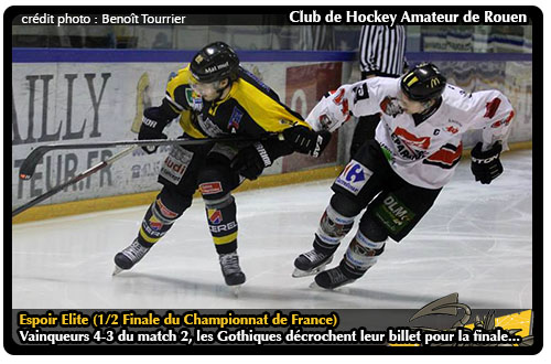 Rarement play-offs en U22 auront été aussi surprenant avec une finale pour le moins inattendu. Lorsque le week-end du 23 & 24 février, Brûleurs de Loups de Grenoble et Dragons de Rouen se retrouvaient sur l'Ile Lacroix, si le rendez-vous était programmé, il ne l'était pas pour jouer les anecdotiques matchs pour la troisième place. En effet, en demi-finale que ce soit à Grenoble ou à Rouen, les outsiders tireront leur épingle du jeu à commencer par Hockey 74 qui arrachait la première 4-3 notamment grâce à un doublé de Jérémy Ares avant de neutraliser le deuxième match 5-5 en dépit d'un triplé du grenoblois Fabien Colotti. Chez les Dragons, pour la troisième fois de l'histoire des play-offs sous cette formule, les deux équipes s'affrontaient avec jusqu'alors deux succès rouennais, l'un la saison dernière en 2013, l'autre en 2004 (présentation) A l'occasion de la première manche, sans jamais réellement parvenir à trouver la solution à l'équation proposée par les Gothiques d'Amiens, les rouennais en réduisant la marque à 2-3 à deux minutes de la fin auront assuré l'essentiel en se maintenant dans la course pour la qualification pour la finale. Pourtant, en ouvrant le score par Anthony Rech, les affaires débutaient plutôt bien côté jaune et noir avant une longue traversée du désert. En égalisant à 1-1, Remi Thomas sonnait la charge pour les artificiers Loïc Coulaud et Marius Serer. Au fil des minutes, inexorablement, les Gothiques étaient parvenus à prendre leur distance au tableau d'affichage avec les Dragons et lorsqu'à deux minutes de la fin en avantage numérique, bien campé à la ligne bleue, Raphaël Faure décochait une flèche scintillante pour réduire le score à 2-3 (résumé) Sur le banc rouennais, on pouvait savourer ce retour au score in-extremis à défaut de victoire. Dès le lendemain, la rencontre virait au cauchemar rouge et noir pour les Dragons avec l'ouverture du score rapide de Marius Serer. En saison régulière, à chaque fois que les Gothiques était parvenus le score, dix fois au total, à chaque fois à la sirène finale, ils avaient humé le succulent parfum de la victoire. Tentant de se rassurer avec l'égalisation de Dimitri Thillet, les rouennais n'en menaient pour autant pas large sur leur glace. Pourtant à deux reprises, les rouennais auront l'occasion de prendre en main la série à la mi-match avec le deuxième but de Johan Saint-André contrarié par l'égalisation de Fabien Kazarine dans la foulée et au début du troisième tiers avec Vincent Nesa pour le 3-2 aussitôt annihiler par le but de Quentin Fauchon. Sale temps pour le Dragon avec l'obligation vitale de marquer au moins un but dans les dix dernières minutes du match pour continuer d'espérer aJetant leurs dernières forces dans la bataille, soustrayant leur gardien pour créer le surnombre, les Dragons tentaient leur va-tout. Une stratégie logique qui ne sera néanmoins pas couronnée de succès, sur une hésitation défensive rouennaise, Quentin Fauchon chapardait la rondelle pour la glisser dans la crosse d'un Nicolas Leclerc auteur du but de la victoire amiénoise (résumé) Fin de rencontre, fin des espoirs pour les Rouennais qui auront à négocier le week-end prochain le match pour la troisième place tandis qu'Amiens aura l'occasion d'aller décrocher un titre qui les fuit depuis 2007 face à Hockey 74.