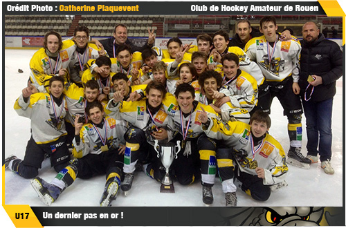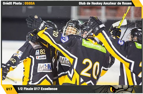 Si dès la deuxième journée, Grenoble (2) pouvait espérer être sacré au prix d'une victoire sur Rouen (2), l'affaire ne tournera pas à l'avantage de la triple entente. Autour de la septième du jeu, l'écheveau de la rencontre se dénouait peu à peu sous l'impulsion du premier but rouennais d'Arthur Papeil en avantage numérique suivi moins de trente secondes plus tard par la réalisation en solitaire du défenseur Maxime Durand. Alors que dans le deuxième tiers, Grenoble (2) réduira le score par Oscar Sciarini, un doublé de Yohann Alzon et Tomas Simonsen dans le troisième tiers permettra aux rouennais de franchir un cap dans ce carré final en s'imposant 4 buts à 1 face à l'un de ses principaux rivaux (résumé) Seuls en tête avec six points, les rouennais n'étaient pas sortis pour autant de l'affaire avec une troisième journée décisive à négocier. Avec la possibilité d'être coiffé au poteau par Courbevoie en cas de victoire des coqs et de défaite de Grenoble ou pire être embringués dans une éventuelle égalité à trois, les risques pour les rouennais étaient réels d'autant plus qu'ils devaient s'acquitter d'une dernière rencontre face à Courbevoie, la bête noire des Dragons en phase de poule. Malmenés par deux fois par les parisiens en saison régulière pour une seule victoire, les rouennais avaient su rétablir la balance à deux victoires de chaque côté en demi-finale avec un succès difficile 5-4. Pour la partie décisive, les rouennais s'en remettront à deux joueurs : leur meilleur compteur du week-end, Pierre Pelletreau et le meilleur buteur rouennais, Arthur Papeil. Le second ouvrant le score après huit minutes de jeu, le premier s'offrant le deuxième but face à Courbevoie. Et lorsque Arthur Papeil à nouveau se signalait en marquant le troisième but avant la mi-match, le dernier pas en or était presque effectué pour les Dragons même si quelques turpitudes viendront tenaillés les rouennais sur la fin du match avec un doublé de Romain Gardair qui permettait aux Courbevoie de revenir 2-3 à deux minutes de la sirène de fin. La couronne presque sur la tête, les rouennais ne céderont pas et s'accrocheront pour remporter un étriqué succès 3-2 (résumé), synonyme de titre de champion de France. En effet, Grenoble aura beau faire tout ce qu'ils pouvaient en s'imposant notamment 3-2 sur Bordeaux pour son dernier match, la défaite de la veille face à Rouen (2) coûtait le titre aux isérois et offrait la possibilité au club rouennais de faire le doublé Champion de France U17 Elite & U17 Excellence.