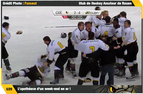 Promis au titre avant la rencontre, les Brûleurs de Loups grenoblois se mettront dans les meilleures conditions possibles pour gérer au mieux leur avance acquise la veille. Alors que bien aidé par le voile de David Fritz-Dreyssé, Joran Reynaud illustrait la bonne entame rouennaise en marquant le premier but après sept minutes jeu, Rouen ne parvenait pas pour autant à faire vaciller le colosse isérois. Un temps menacé dans le premier tiers, au moment d'aborder le tiers médian, les Brûleurs de Loups remettront les pendules à l'heure en deux temps. Une première fois par Hugo Dechelle à la déviation sur un lancer de Sacha Reboh et dans la foulée par Florentin Lardy qui coupait une passe de Pierre Robert pour le 2-1 à la dernière seconde du deuxième tiers. Le tournant du match. Fous furieux après l'arbitrage estimant à juste titre que le deuxième but grenoblois était entaché d'une crosse haute, de ce petit fait de match naitra une forte frustration chez les Dragons et un sentiment de révolte qui emportera tout sur son passage au troisième tiers. Alors qu'au cumul de deux matchs, le retard des rouennais s'élevait déjà à trois buts soit plus que le total qu'ils avaient été capable de marquer en quatre confrontations en saison régulière, loin de les effrayer, le challenge, parfumé par le sentiment de l'injustice du deuxième but, libèrera les Dragons. Débridés les rouennais dans les cinq premières minutes du troisième tiers renverseront en partie la rencontre. Au rebond sur un lancer de David Fritz-Dreyssé, Julien Msumbu égalisait à 2-2 alors que dans la foulée c'est Joran Reynaud qui portait une nouvelle estocade pour le 3-2. A quinze minutes de la fin du match, il manquait encore un but aux rouennais pour espérer décrocher a minima la prolongation. Assiégeant la zone défensive de Grenoble, les Dragons prenaient leurs responsabilités et tentaient de forcer leur destin face à une équipe iséroise pour le moins fébrile sur cette fin de rencontre à l'image d'Alexandre Pascal, un brin niais sur l'affaire qui concédait deux minutes de prisons à cinq minutes de la fin de la rencontre. Moment clef pour les rouennais qui allaient en profiter superbement. Sur un lancer de Jules Lefebvre, le palet trainait devant la zone de Julian Junca, de quoi exciter l'appétit de Doryan Besseau qui en profitait pour tenir parole et marquer le quatrième but rouennais. Incroyable retournement de situation pour les Dragons qui désormais pouvaient envisager d'aller chercher le graal en prolongation. Un sur-temps à l'avantage des Dragons qui auront l'occasion de crucifier les isérois par l'intermédiaire de David Fritz-Dreyssé puis Arthur Nadaux. Un suspense insoutenable, intenable qui ne trouvera pas son dénouement dans la prolongation mais dans une séance de tirs aux buts inédite en finale du championnat de France Espoir. Incroyable fin de suspense avec l'ouverture du score de Lucas Bonnardel à laquelle répondait Joran Reynaud. Les autres tireurs ayant échoué, c'est Arthur Nadaux qui aura le palet du match et qui le mettra au fond pour la victoire jaune et noir (résumé) Tout un symbole ! « On va le faire ! » disait-on hier soir dans le camp jaune et noir. C'est désormais chose faite, ils l'on fait ! Et apportaient au club de Rouen son septième titre en Espoir ! Incroyable week-end pour le hockey rouennais avec deux titres dans la même journée en U17 (bilan 2016-2017) et U20.