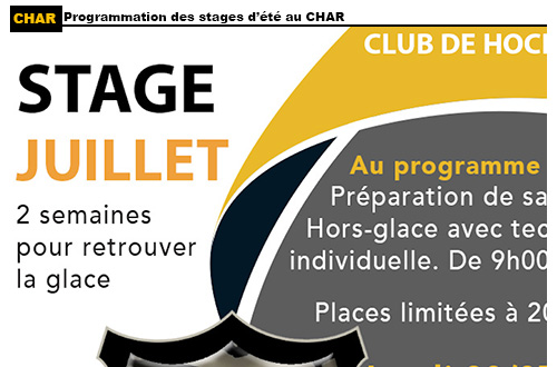 Bien que perturbée par des circonstances exceptionnelles, la programmation des stages d'été du Club de Hockey Amateur de Rouen avance à grand pas ! Si les modalités du stage d'août restent encore à définir, le CHAR vous propose d'ores et déjà deux semaines en juillet pour reprendre goût à la glace en toute sécurité en respectant strictement bien entendu le protocole sanitaire liée à la pandémie du COVID-19.