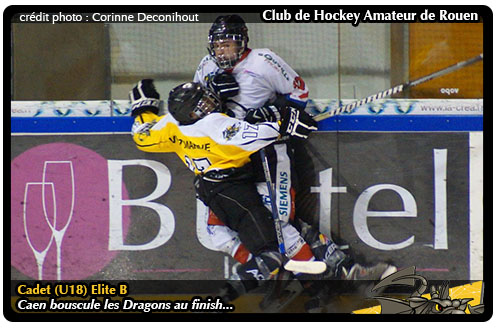 En Basse-Normandie dans un premier temps, à Caen avec le point de la prolongation même si le déroulement de la rencontre laissera aux rouennais d'immenses regrets. Avec deux buts de Victor Ramos et un but de Nicolas Plaquevent, les rouennais auraient pu espérer mieux avant de basculer dans une deuxième partie de match catastrophique avec quatre buts encaissés dont un en prolongation pour Théophile Miquelot pour un insuccès 3-4. Sans grande perspective à l'avant du classement avec un écart rédhibitoire sur Anglet et Hockey 74 juste devant les normands, les rouennais devaient absolument se maintenir à la huitième place pour au moins espérer bénéficier de l'avantage de la glace pour le premier tour des play-offs. Point culminant de la dépression jaune et noir, il y a quelques mois avec un lourd revers 7-4, à l'heure du match retour face à Meudon, les Dragons profiteront de la visite des parisiens pour assurer l'essentiel avec trois points riches en valeur au bénéfice d'un probant et propre succès 5-0 (résumé) Tout proches d'atteindre leur objectif, les rouennais verront leur lamentable déroute au Pays Basque 14-2 face à Anglet comme un simple contre-temps. En effet, au gré des matchs en retard récupérés, seul Amiens (2) pouvait encore espérer chaparder la huitième place jaune et noir au terme d'une ultime confrontation entre les deux éternels rivaux. Avec en jeu la huitième place, au Coliséum picard, les rouennais pourtant menés pendant quarante minutes, 2-0, 3-1 puis 4-2, parviendront à revenir au score par l'entremise de Hugo Dumont et Robin Rabl avant d'assister au cinquième but rouennais de Guillaume Dutot, le tout dans les trois premières minutes du dernier tiers. Vainqueurs 5-4, les rouennais, en dépit d'une saison régulière crispante pouvaient encore espérer sauver leur année en play-offs avec la confrontation face au Pole France Féminin.