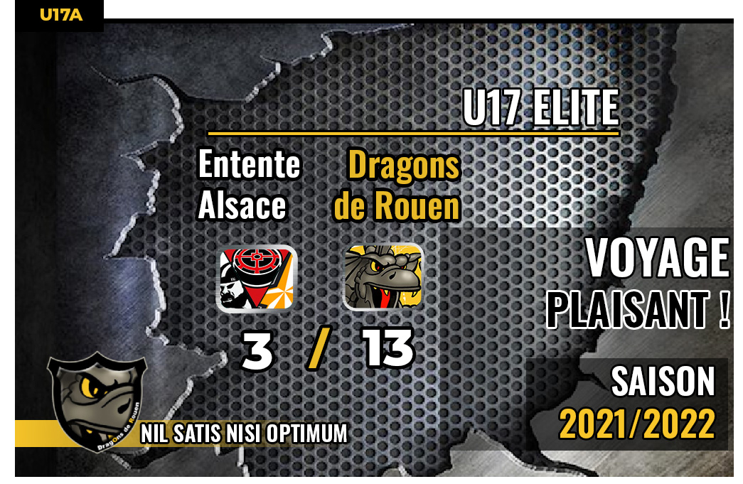 Après un probant succès acquis sur le score de 7 à 0 chez les Ducs d'Angers, les Dragons U17 avaient à cœur de poursuivre leur parcours, cette fois en Alsace, face à l'entente Alsace. Et le moins que l'on puisse dire c'est qu'au terme d'une rencontre rondement menée, les rouennais auront soigné la manière en s'imposant sur le large score de 13 buts à 3.