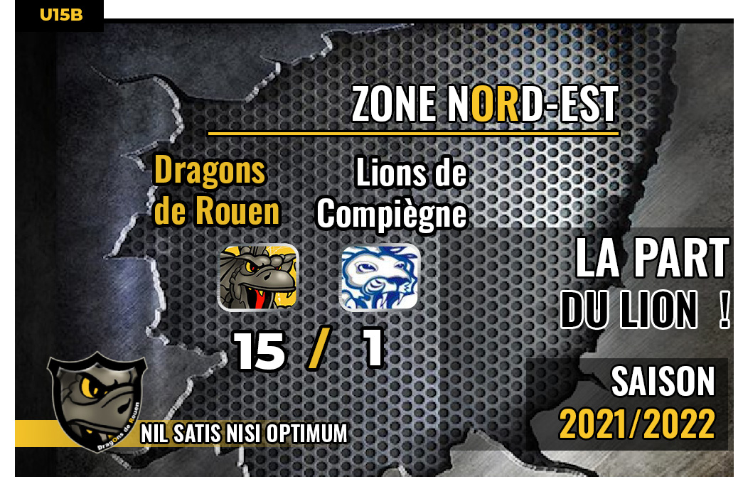 A court d'effectif en se présentant sur l'Ile Lacroix avec seulement huit joueurs, l'équipe U15B des Lions de Compiègne, bien que forfait, aura mis un point d'honneur à honorer sa sortie sur l'Ile Lacroix avec à la clef un lourd mais courageux revers 1-15 face à des Dragons déchaînés offensivement.