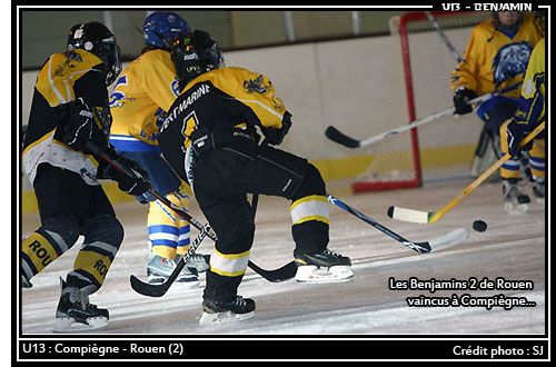 Parti tôt de sa contrée normande, traversant les brumes matinales, le Dragon Benjamin de Rouen II renforcé par quelques plus jeunes dragonnets de la famille, se préparait avec joie et allégresse à sa visite en Picardie. Prêt à affronter les rugissements et éviter les brûlantes morsures du Lion, le Dragon jaune et noir s'installait tranquillement sur son lieu de bataille avant de livrer le combat face au Lion. Certes pour les spectateurs de la patinoire de Compiègne, le tableau d'un lion affrontant un Dragon pouvait paraître surprenant mais quoiqu'il en soit les deux protagonistes de notre histoire n'en avait cure et commençaient à se chamailler pour le petit morceau de caoutchouc, objet de tous les désirs. Tentant d'égratigner la fière carapace du Dragon, le griffes du lions se montraient particulièrement tranchantes en ce début de courtoise rencontre. Ainsi, profitant d'un moment d'inattention du Dragon, le lion paré de jaune et de bleu plantait une première croc dans la carapace de son adversaire. Le lionceau Olive Louis rugissant de plaisir après avoir obtenu le premier palet victorieux de la rencontre ne comptait pas en rester là. Même si le Dragon, un tantinet agacé, sortait sa plus belle tornade de flamme en égalisant par Robin Rabl, décidément plus vif sur l'aire glacée compiégnoise, le Lion répondait du tac au tac à l'ensemble des attaques du Dragon.