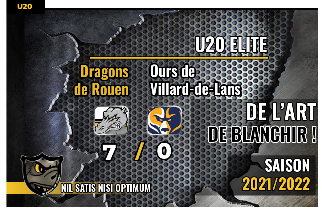 Si l'on ajoute les 103 secondes du match face à Grenoble, la défense jaune et noir n'aura plus encaissé de buts depuis 3 heures, 1 minute et 43 secondes. Une belle performance, en cours, que les Dragons doivent bien sur à leurs portiers mais également à une défense solide, travailleuse qui laisse l'équipe normande à la place de deuxième défense du championnat derrière les Ducs d'Angers (2,00 pour les Ducs contre 2,30 pour les Dragons) Mieux pour les rouennais, s'ils font preuve d'une belle solidité défensive, l'attaque loin d'être en reste truste la première place loin devant son rival Grenoblois (6,60 contre 5,90) et les Ours de Villard-de-Lans à l'occasion de la 11ème journée en auront fait les frais en dépit de la performance qu'il faut saluer des deux portiers vertacomicoriens, Aubin Narbonne et Maël Halladj qui tous deux auront empêché que la note soit bien plus salée pour les isérois. Inévitablement avec son attaque de feu, il n'était pas surprenant de voir le Dragon craché des flammes dès la première période. En l'espace des vingt premières minutes, les rouennais se mettront à l'abri au tableau d'affichage à commencer par l'ouverture du score que trouvait Tommy Perret dans les dix premières minutes de jeu (07'21) Reprenant cinq minutes plus tard par un deuxième but pour Jonas Lemetais (12'09), dominateurs, les Dragons mettront la pression tout au long de la période sur une arrière-garde villardienne déjà proche de la rupture alors que successivement Jordan Hervé (17'50) et Antoine Addamo (18'33) se relayaient pour porter le score à 4-0 à la fin du premier tiers.