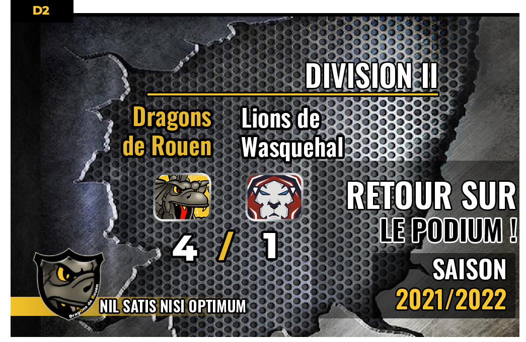 Parfaite deuxième pour les Dragons et encore vingt minutes à négocier pour capturer trois points et faire une excellente opération au classement avec les défaites de Reims à Valenciennes (2-1) et celle des Français Volants (6-5) face à Angers (2) Sur le podium de la poule derrière l'intouchable duo Meudon-la-Forêt – Valenciennes, tel était l'objectif des rouennais pour cette dernière période. Contraints de s'acquitter de trois infériorités numériques dans cette période (46'55, 52'04, 56'00), difficile pour les Nordistes de faire le forcing pour revenir au score alors que du côté jaune & noir, les opportunités filaient sans que les Dragons soient en mesure de tuer définitivement tout suspense dans la partie jusqu'à l'amorce des dernières minutes du match et les dernières forces jetées dans la bataille de part et d'autre avec un heureux dénouement pour les Rouennais, un quatrième but déjà, celui d'Adam Maheut (58'13) dans les deux dernières minutes de la partie et surtout la sirène finale synonyme de délivrance et de victoire 4 buts à 1