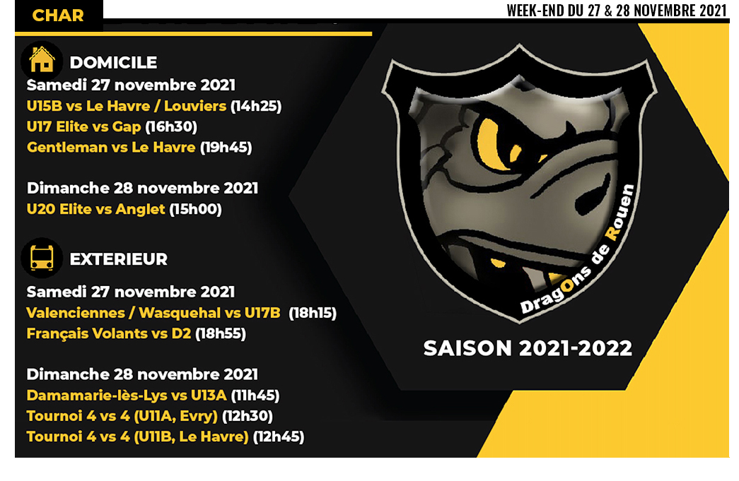 Avec huit rendez-vous pour ce dernier week-end de novembre, le Dragon jaune & noir du Club de Hockey Amateur de Rouen sera sur le front un peu partout avec des rendez-vous clefs à ne pas manquer.