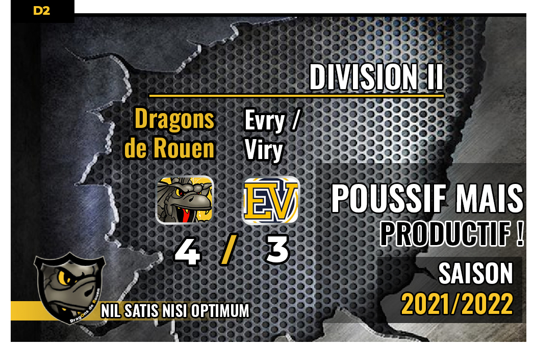 Bien accrochés à la troisième place du podium de sa poule à cinq points de l'infernal duo Valenciennes / Meudon, les Dragons de la Division 2 jaune & noir en recevant l'avant-dernier de la poule, Evry / Viry, pouvait caresser le secret espoir de tenir à distance encore une journée supplémentaire ses chasseurs, Français Volants & Reims. Encore sous le coup de la déception de la dernière journée au cours de laquelle les Dragons avaient du se résigner à abandonner la victoire 5-4 aux Français Volants de Paris dans les dernières secondes du match, face aux franciliens d'Evry / Viry, les rouennais se montreront particulièrement prudent durant le premier tiers. Il est vrai qu'avec les diverses absences liées aux blessures, suspension ou autres appelés en équipe de France, rien n'incitait à la hardiesse même si durant toute la première période les normands parviendront à tenir le rythme, bien que ne parvenant pas à trouver le chemin des filets, le filet bien gardé par Valentin Duquenne restait désert. Habitués à impulsé un haut rythme au jeu sur la glace contrariant sensiblement les équipes plus expérimentées,face aux Parisiens, les rouennais semblaient avoir toutes les peines du monde à mettre du rythme.