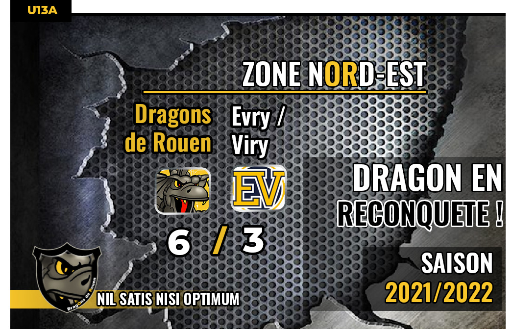 Tourmentés le week-end dernier par les Caribous de Dammarie-lès-Lys (victoire parisienne 4-3), les Dragons U13, cette fois sur leur Ile Lacroix, auront retrouvés le sourire en s'imposant 6-3 face à d'autres franciliens, ceux d'Evry / Viry.