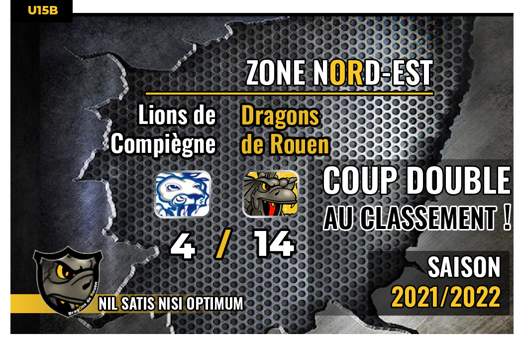 Au lendemain de son probant succès face à la triple entente Dunkerque / Valenciennes / Wasquehal (8-2, lire par ailleurs), les U15B rouennais auront fait coup double au classement, cette fois en déplacement à Compiègne avec un large succès 14-4 face aux Lions. De quoi titiller sérieusement la première place tenue jusqu'alors par les Gothiques d'Amiens (2), seule équipe à avoir battu les Dragons jusqu'à présent cette saison.