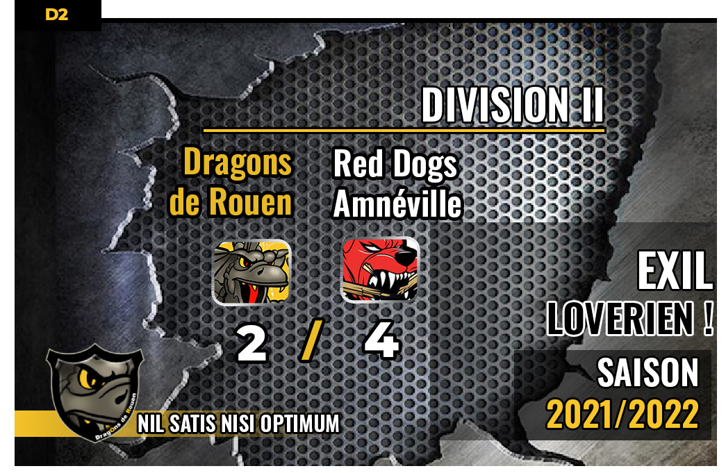 Insouciance de la jeunesse, mental en acier, à voir quoiqu'il en soit la force de résilience des rouennais fera merveille une nouvelle fois dès les premières présences du tiers médian avec la réduction du score à mettre à l'actif de Matéo Bussat (22'15) Avec la prise de relais dans la foulée de Hugo Raveaud, peu avant la mi-match (29'01), c'est une équipe jaune et noir à nouveau conquérante qui mettait toutes les chances de son coté pour faire basculer la rencontre en leur faveur. Néanmoins, du côté des mosellans, ils pouvaient compter sur la force de frappe leur meilleur compteur montréalais. Déjà auteur de 18 points pour 5 buts avant la rencontre, Maxime Griet faisait mal aux Dragons à l'amorce du troisième tiers en coupant l'élan seino-marin avec un quatrième but décisif. En effet, avec un premier tiers largement remporté par Amnéville (3-0) et la revanche du deuxième tiers jaune et noir (2-0), le tiers de la belle se résumera à cet unique but des Red Dogs, les Dragons en dépit de quelques situations dangereuses notamment en avantage numérique ne parviendront pas à égaliser, ni même réduire l'écart, scellé à deux buts pour un succès de la Moselle, 4 buts à 2. Vainqueurs lors des trois dernières journées de deux des trois pensionnaires du podium, Rouen 4-2 donc et la semaine dernière Valenciennes 4-3 aux tirs au but, seul l'intouchable Meudon, large vainqueur 10-1 des Red Dogs, les joueurs d'Amnéville poursuivent leur remontée au classement et talonnent désormais les Dragons à la quatrième place avec deux matchs en plus, Rouen avec deux matchs reportés face aux Français Volants et Courbevoie devant s'acquitter la semaine prochaine d'un épineux déplacement chez les Diables Rouges de Valenciennes. Loin d'être une partie de plaisir pour les rouennais même si les nordistes restent en quête de leur première victoire en 2022 avec trois défaites de rang : Meudon (6-3), Amnéville (4-3 tab) et Reims (1-0)