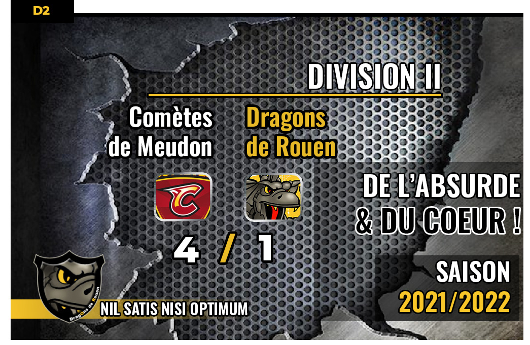 Tournant à deux centres, Jonas Lemetais & Charles Pelletreau, huit ailiers et cinq défenseurs, les Dragons joueront crânement leur chance jusqu'à la sirène finale, se payant même le luxe de soustraire leur gardien en fin de rencontre pour tenter de revenir au score (58'02) Entre temps, en marquant le troisième but francilien (58'04), le letton Romans Nekludovs avait densément plombé les espoirs de « belle histoire » jaune et noir, mais jusqu'au bout les Dragons livreront bataille, en cage vide, Thomas Mathieu (58'54) mettant un terme à tout suspense, Meudon-la-Forêt scellant, ainsi, sa victoire sur le score de 4 buts à 1, troisième défaite de suite pour le camp jaune et noir. Le pragmatisme du classement et de la comptabilité des points n'ayant que faire du cœur et du courage, bien que vaillante la D2 jaune et noir réalise une bien mauvaise opération en dégringolant à la septième place de sa poule, juste devant son alter ego d'Angers. Néanmoins, avec encore trois matchs à jouer « théoriquement », Français Volants, Courbevoie et Angers (2), trois points séparent les rouennais du quatrième Amnéville auquel il ne reste plus qu'un match à jouer. Une quatrième place si importante dans l'optique des play-offs avec l'avantage de la glace.