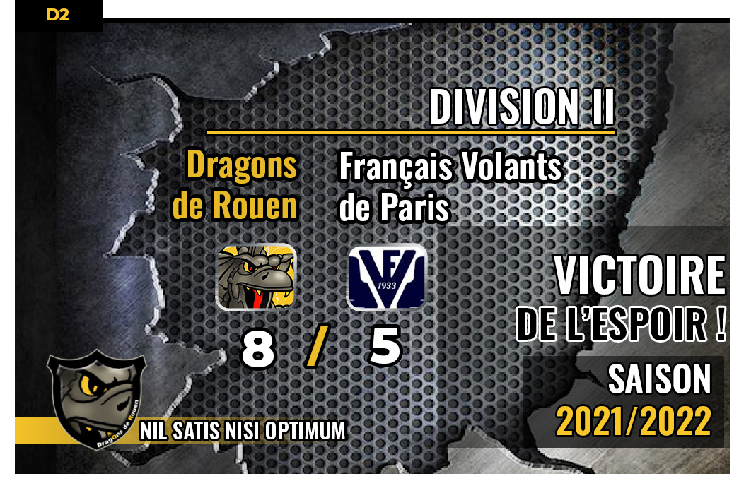 A force de trop jouer avec le feu, les Dragons finiront par se brûler à l'entame du troisième tiers, au détour d'une séquence en avantage numérique parisienne qui permettait à Léo Cuzin d'égaliser à 4-4 pour les Français Volants (44'03) Frustrant, agaçant, contrariant, les qualificatifs ne manquaient pas pour décrire la situation jaune et noir à cet instant de la rencontre. Fort heureusement dans le camp jaune et noir, les regrets seront rapidement dissipés alors qu'Antoine Addamo sortait son plus beau lancer pour porter le score à 5-4 (49'20) Salvateur. Encore quelques minutes à jouer dans cette périlleuse rencontre et plus que jamais les Dragons se trouvaient sous la menace d'un énième retour au score d'une équipe des Français Volants qui en six confrontations sur l'Ile Lacroix se sera toujours imposé. Pour autant cette fois, les rouennais semblaient tenir le bon bout en faisant rimer triplé avec Lemetais, Jonas particulièrement précieux offensivement se chargeant de trouver le sixième but dans un angle particulièrement fermé (54'51) Désormais cinq minutes à parcourir dans une rencontre « a priori » maitrisée par les rouennais même si les Français Volants jèteront leurs dernières forces dans la bataille avec la soustraction de leur portier (58'02) qui offrait juste la possibilité à Hugo Deberge de dégager son camp en s'offrant au passage la cage vide et le 7ème but jaune et noir (58'46) Loin d'être finie, la rencontre donnera lieu à une fin de match ubuesque. Le trio d'ex-rouennais, Nadaux – Athuil – Dumont s'illustrait en ramenant le score à 7-5 (59'31) alors que dans la foulée toujours en cage vide, Johanès Avonde y allait de 8ème but jaune et noir (59'43) Vraisemblablement blessée la gardienne parisienne ne regagnera pas sa cage et les Volants finiront la rencontre avec un filet désert avec un neuvième et dernier but jaune et noir invalidé par l'arbitre, le palet ayant franchi la ligne après le gong final d'une rencontre à l'issue farfelue.