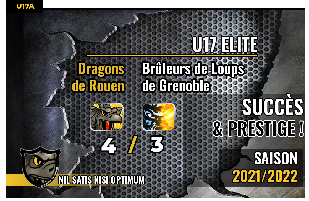 Pour trouver trace d'une équipe invaincue en Cadet Elite en saison régulière, il faut remonter seize années en arrière en 2005-2006, cette année là, c'est Rouen qui s'accoquinait avec le classement avec un bilan de 22 victoires, 2 matchs nuls, 0 défaite avant d'être battu par l'impertinente équipe amiénoise lors d'un épique et historique carré final disputé sur les bords de Seine, les plus anciens s'en souviennent encore, Mr Jean Leblond en chef de file. Avec 18 victoires de suite, la cuvée 2021-2022 grenobloise avait la possibilité d'effacer des tablettes le record rouennais. 18 victoires sur 20. Une très belle note, cela étant mais qui ne suffira pas pour entrer dans l'histoire. En effet, même si Arthur Mattioni à moins d'un quart d'heure de la fin trouvait l'égalisation à 3-3 (48'45), à trois minutes de la fin de la rencontre, Anatole De Mali se chargeait d'inscrire le but de la victoire, le quatrième rouennais, celui de la délivrance, celui de la victoire, celui de la récompense, celui de la fin de frustration face à Grenoble pour un succès 4-3 qui met un terme définitivement à l'invincibilité grenobloise, le prestige rouennais est préservé, remerciements à l'équipe jaune et noir et à surtout Remi Peronnard pour le travail accompli entre les deux rencontres.