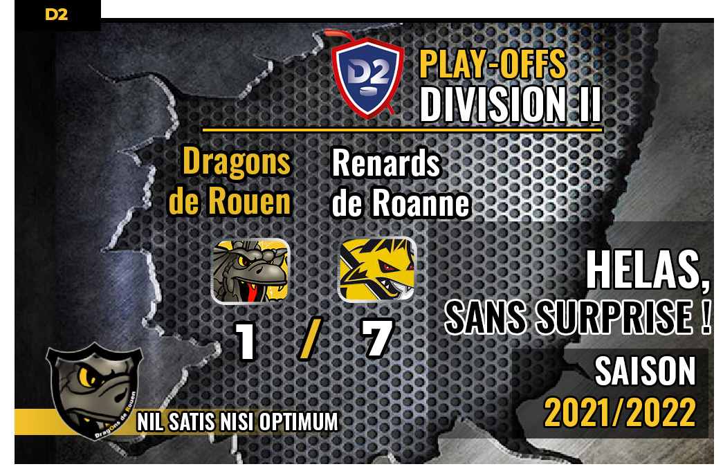 Pressés comme rarement lors du match aller disputé à Roanne notamment lors d'une première période particulièrement ardue pour l'escouade normande, les Dragons de la D2, cette fois, à domicile auront fait mieux que défendre les couleurs jaune et noir bien que s'inclinant sur le score de 7 à 1, une défaite synonyme de fin de saison pour les rouennais.
