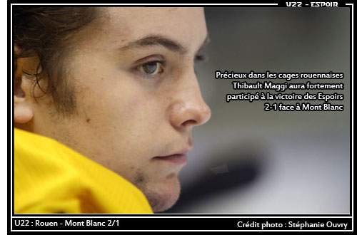 Au terme d'une rencontre difficile, les espoirs rouennais seront parvenus à défendre leur « pré carré » face à Mont-Blanc en s'imposant 2 buts à 1, conservant ainsi son fauteuil de leader du championnat Espoir Elite. Entre les blessures, les malades, les joueurs appelés à disputer la finale de la Coupe d'Europe à Minsk, c'est une équipe espoir rouennaise diminuée qui affrontera son homologue de l'association Chamonix – Saint Gervais – Megève. Ouvrant le score en deuxième période par Quentin Berthon (37'51), les montagnards parviendront à égaliser dans la foulée en avantage numérique par Clément Colombin (39'43) Heureux de prendre l'avantage peu avant les dix dernières minutes toujours par Quentin Berthon (47'17), les Dragons, au prix de solides efforts à l'image de leur gardien Thibaut Maggi, très en vue durant la rencontre, parviendront à tenir le score de 2-1 en l'état jusqu'à la sirène finale.