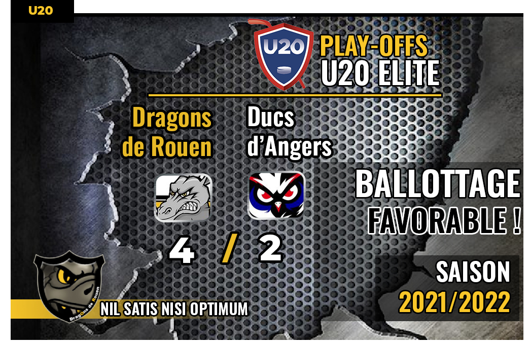 Première manche pour les Rouennais U20 face aux Ducs d'Angers et première victoire pour les Dragons 4 buts à 2, une situation de ballotage favorable pour les « jaune & noir » qui ne devra pas faire oublier la deuxième manche dimanche. Tout reste à faire.