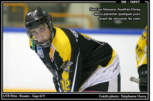 Après une reprise 2011 en douceur à Angers et une victoire 8-1, c'est face à Gap que les Cadets Rouennais devaient disputer leur premier match de la nouvelle année à domicile. Un copieux menu pour les cadets de Nordine Mahdidi au coude à coude au classement face à un adversaire reputé coriace. De fait, les gapençais feront honneur à leur réputation en sortant de la période période en menant au score 2 buts à 1 face à des dragons encore sur la réserve. Pourtant, avant la barrière des dix premières minutes, l'ouverture du score rouennaise avait de quoi donner le sourire. Sur un palet sorti de la zone défensive rouennaise dans le couloir par le couple Alexandre Lubin – Florian Duval, ce dernier s'envolait en direction de la cage montagnarde. Astucieux, l'international faisait flotter le palet devant la crosse du défenseur gapençais sur son repli, à destination d'Alexandre Lubin toujours dans la course. En situation de deux contre zéro avec Johan Saint-André à sa gauche, le numéro 19 jaune et noir prenait un lancer que le portier gapençais ne parvenait qu'à ralentir. A l'affût, Florian Duval parachevait le travail pour le 1-0 (09'22) Un début de match en fanfare pour les joueurs de Nordine Mahdidi qui laissait présager d'une partie réjouissante. Malheureusement pour les jeunes Dragons, ils devaient se résoudre à abandonner sur blessure leur coéquipier Aurélien "Papy"Dorey touché au dos (11'13) Alors que le défenseur rouennais à qui tout le monde souhaite un retour rapide sur le glaçon ne pourra suivre la fin de la rencontre, les Dragons, un soupçon déboussolés, perdaient le fil de leur partie. Même si le duo Duval – Lubin continuait de donner le tournis à Lucas Savoye, le gardien des Alpes (12'30), le score de la première période basculait au moment d'aborder les cinq dernières minutes.
