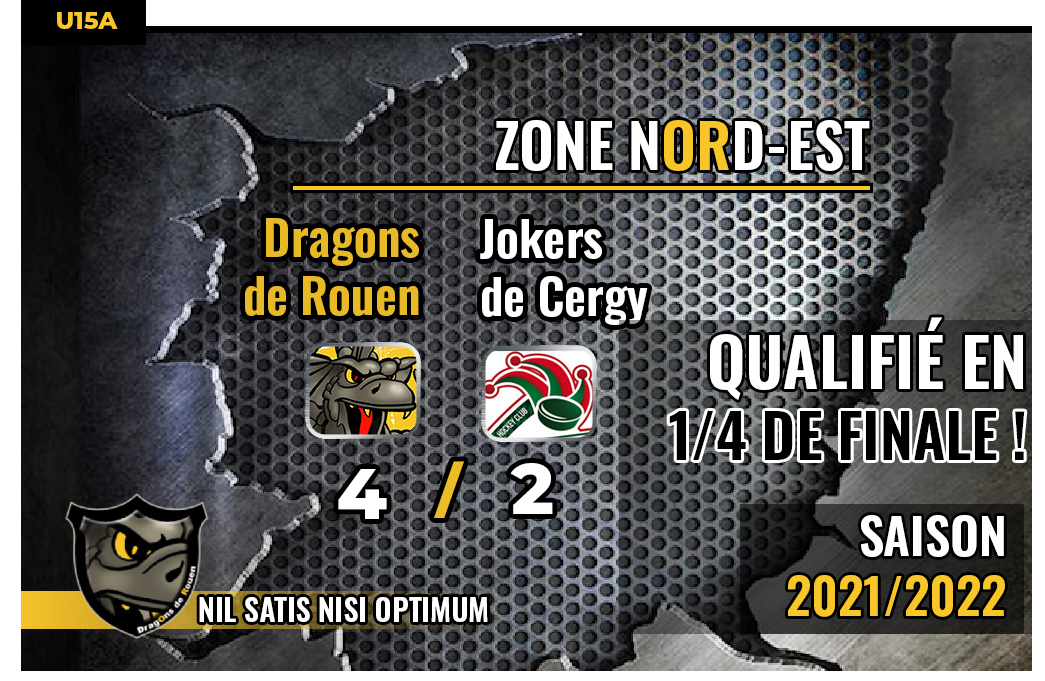 Bien que concédant la première place de la poule play-offs aux Gothiques d'Amiens, les Dragons U15, en s'imposant 4 buts à 2 face aux Jokers de Cergy ce dimanche, auront validé définitivement leur qualification pour les play-offs.