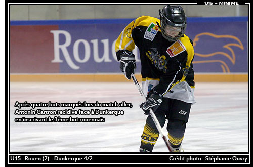 Au début de la troisième période, l'arbitre de la rencontre affirmait son autorité et sanctionnait Aubin Lecointre de deux minutes de cinglage plus dix minutes de méconduite qui feront trouver le temps long sur le banc au pauvre rouennais. Les quinze dernières minutes de jeu démarraient en infériorté pour les pensionnaires de l'Ile Lacroix et ça chauffait dur devant leur cage. Sur un petit jeu de passe derrière et devant le but adverse étourdissant les défenseurs adverses, Antonin Cartron assisté d'Harmand Poupart inscrivait le troisième but rouennais (33'45) La riposte dunkerquoise était quasi instantanée car une minute plus tard, c'était au tour des rouennais de ramasser la rondelle au fond de leur filet. Profitant d'un cachot pour les corsaires, pendant deux minutes toutes les tentatives normandes allaient échouer. Mettant le feu malgré tout à la défense nordiste, à trois minutes de la fin du temps réglementaire c'est Barthélémy Dereux qui inscrivait le dernier but bien aidé par Brieuc Houeix et Aubin Lecointre. C'est sur le score de 4 buts à 2 à la faveur des Dragons que les deux équipes se quittaient en serrant la main.