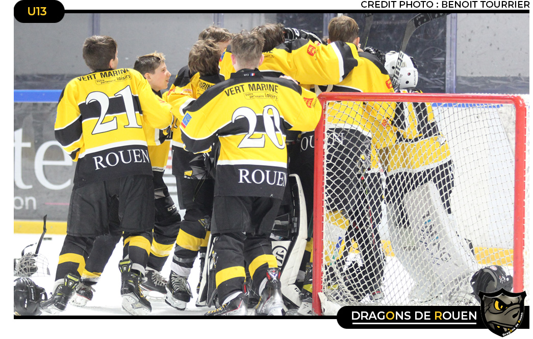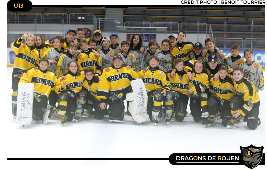 Huit équipes en lice, une seule pour soulever le trophée du tournoi U13 « François Legay » Passées deux premières journées de matchs de poule qui aura vu Caen dominer le classement devant Rouen et Dammarie, lors des matchs de play-offs, une bataille glacée de haute lutte sacrera les Dragons de Rouen à l'issue d'une truculente finale remportée 3-1 face aux Drakkars de Caen