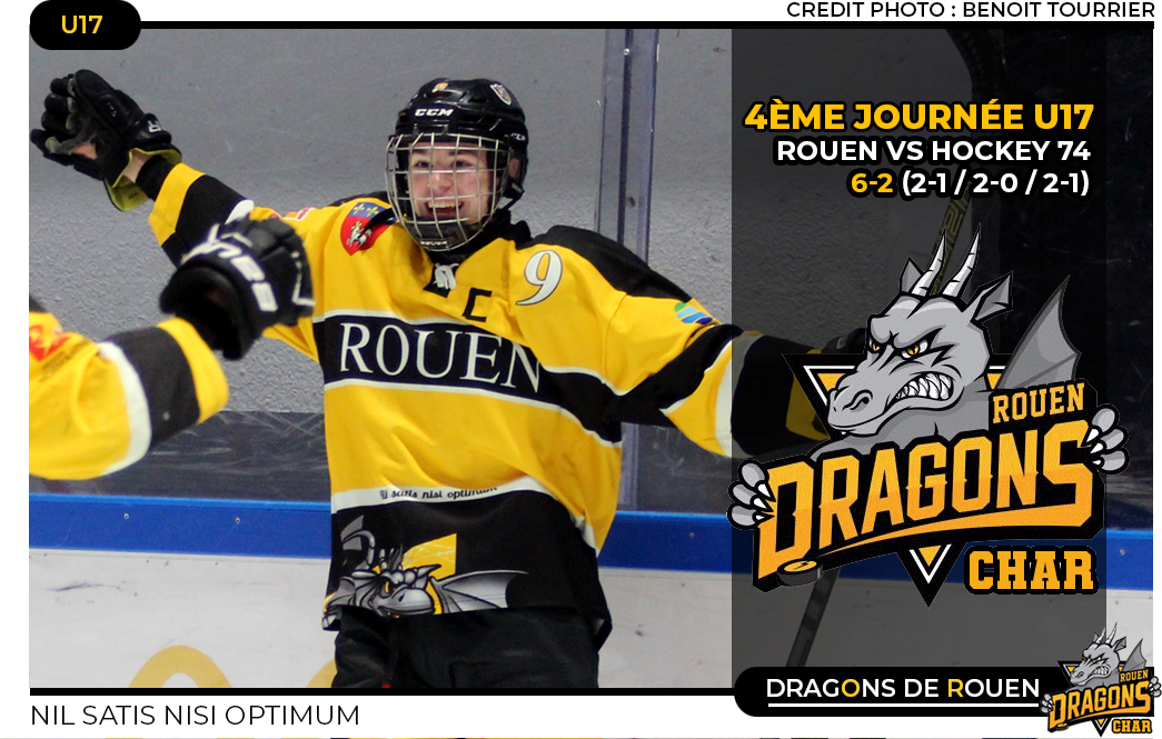 Moins d'une minute après le départ du troisième tiers, déjà la dette du Hockey Club 74 se creusait sensiblement au rythme endiablé des buts s'amoncelant dans le camp rouennais. Comme annoncé, le défenseur rouennais Papys Da Sylva s'illustrait en marquant un but, n'oubliant pas de célébrer le regard amoureux en direction des tribunes (42'14) Un cafouillage plus tard qui permettait à Felix Gaultier de servir Aaron Stemper pour le 6-1 (43'36), les visiteurs n'étaient plus très loin de la cessation de paiement même si toujours actif Gaspard Alric se retrouvait esseulé face au portier rouennais pour le deuxième but du HC 74 sur une passe d'Anakin Drif tout heureux de profiter d'un bégaiement défensif rouennais (44'09) Efficaces tout au long de la rencontre, les Dragons le seront moins en fin de partie, un dernier quart d'heure, un peu poussif ne changera pas l'issue de la rencontre, en pleine croissance, les rouennais sauront patienter tranquillement jusqu'à la sirène finale pour célébrer leur succès 6 buts à 2.