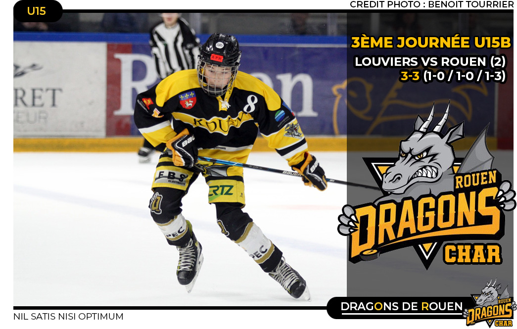 Alors que l'on retrouvera ce même duo sur le troisième but de Louviers à quasiment dix minutes de la fin du match, auparavant, les Dragons trouveront enfin les ressources nécessaires pour toucher cible et mettre à mal l'arrière-garde des canidés. Et dans ce domaine, c'est l'attaquant Enzo Quitteville qui se montrera le plus besogneux et le plus vertueux. Assisté par deux fois de Noé Lebunetelle, l'attaquant rouennais, par deux fois, catapultait avec résolution le palet au fond des filets lovériens (41'09 & 48'01) Retour à parité. 2-2 à douze minutes de la sirène finale. Volontaires et désireux de ne pas se laisser ainsi tancer, les locaux réagiront aussitôt par leur infernal duo, cette fois, Pacôme Allain alimentant Timéo Quichon pour le 3-2 lovérien (48'33) Là encore, les Dragons Rouennais n'abdiqueront pas et feront en sorte de souhaiter un joyeux anniversaire à leur défenseur Tilio Cudicio en allant arracher l'égalisation à 3-3 à moins de dix minutes de la fin de la partie (50'19) Du temps restant il ne sera pas question d'autre but mais pour les deux équipes l'essentiel n'était pas là, il était plutôt dans cette volonté farouche de tout donner sur la glace et en cela la rencontre des deux équipes sera une parfaite réussite.