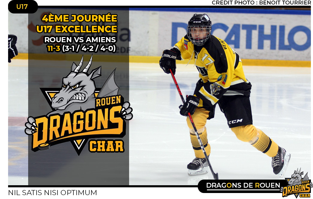 Collés à 4-3 par une équipe amiénoise comme à l'accoutumée accrocheuse, les Dragons auront la bonne idée de s'en remettre à ses surclassés, Arthur Daubeuf (34'12), Enzo Everaert (37'01 et Arthur Le Roscouet (38'52) pour prendre le large avec trois buts catapultant l'escouade jaune et noir à 7-3. Dès lors, avec une avance de quatre buts à l'entame du dernier vingt minutes, il était difficile d'envisager une inversion de tendance au score pour les rouennais d'autant plus que dès les premières minutes, Thibault Blondel se servait d'une passe d'Arthur Le Roscouet pour inscrire le huitième but rouennais. Le ton était donné. La tête sous la glace au tableau d'affichage, l'équipe amiénoise tentera bien de mettre en branle la révolte mais rien n'y fera, au contraire, décisif tout au long de la rencontre, Arthur Daubeuf signait le triplé (47'43) alors que Enzo Everaert (51'02) et Paul Lubin (52'37) venaient compléter la feuille des buts pour une victoire rouennaise 11 buts à 3.