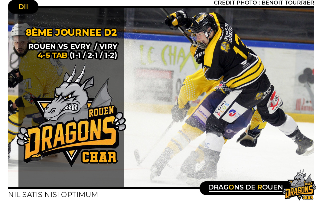 Au coude à coude au classement avec son adversaire du soir, tout au long de la rencontre, les deux équipes se livreront à un intense mano a mano obligeant les rouennais à patiner fort derrière le score dès la première période alors que sur une fulgurante contre-attaque, en deux contre un, Clément Lallemand, pour les parisiens, trouvait l'ouverture du score (14'09) Même si la réaction jaune & noir ne se fera guère attendre, à peine deux minutes plus tard, Tommy Perret donnant la réplique sur un scintillant mouvement collectif orchestré par Fabian Riu & Jordan Hervé (16'18), des forces dans la bataille, les Dragons avaient laissé avant une nouvelle passe d'armes intense programmée pour la deuxième période. Pourtant, c'est sur le sourire du néo-attaquant Thomas Vandeputte que la deuxième période débutait, le rouennais tout heureux d'avoir saisi sa chance pour marquer le deuxième but des Normands (22'44) Pour la première fois devant au tableau d'affichage, les Dragons le resteront une dizaine de minutes, le temps pour les franciliens de reprendre leurs esprits et de frapper par deux fois en trois minutes, Jérémy Pigeot (32'08) puis Nick Graziano (35'25) exploitant quelques largesses défensives rouennaises. Rageant, de 2-1 à 2-3 en l'espace de quelques minutes, la fin du deuxième tiers était fatal aux Dragons alors qu'Evry / Viry débutait le troisième tiers en menant d'un but.