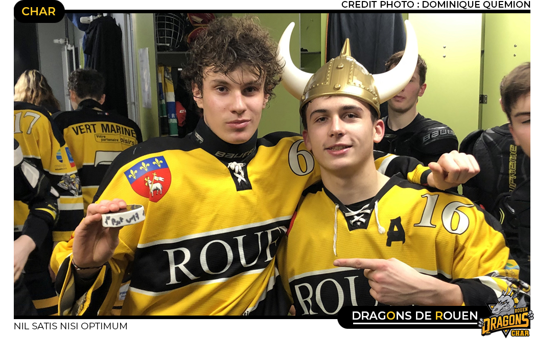Toujours sur les bords de Seine mais cette fois en U17 Elite, les rouennais auront fait une très belle affaire au classement. Alors qu'il ne reste plus que six matchs de saison régulière pour les Dragons dont quatre face à l'ogre grenoblois, les rouennais en s'imposant 9-4 face aux Ducs d'Angers auront assuré mathématiquement leur deuxième place de la poule. Emmenés par un Paul Le Lem enthousiaste auteur de six points sur la rencontre, un triplé & trois mentions d'assistances, les rouennais feront en sorte de se faciliter la tâche en sortant du premier tiers en menant 3 buts à 1. Si l'écart grandira densément jusqu'à la mi-match jusqu'à 7-1, un trou d'air dans les cinq dernières minutes du deuxième tiers permettra aux Ducs d'Angers d'inscrire trois buts et de revenir à 7-4. Coup d'épée dans l'eau pour les ligériens, Noa Besson & Baptiste Bouilloux lors du dernier vingt minutes auront la malice d'inscrire un but chacun pour clore le score à 9-4. Désormais assurés de terminer a minima à la deuxième place de la poule, les rouennais peuvent désormais se tourner exclusivement vers cette quadruple confrontation face aux Brûleurs de Loups de Grenoble, toujours invaincus après quatorze rencontres jouées.