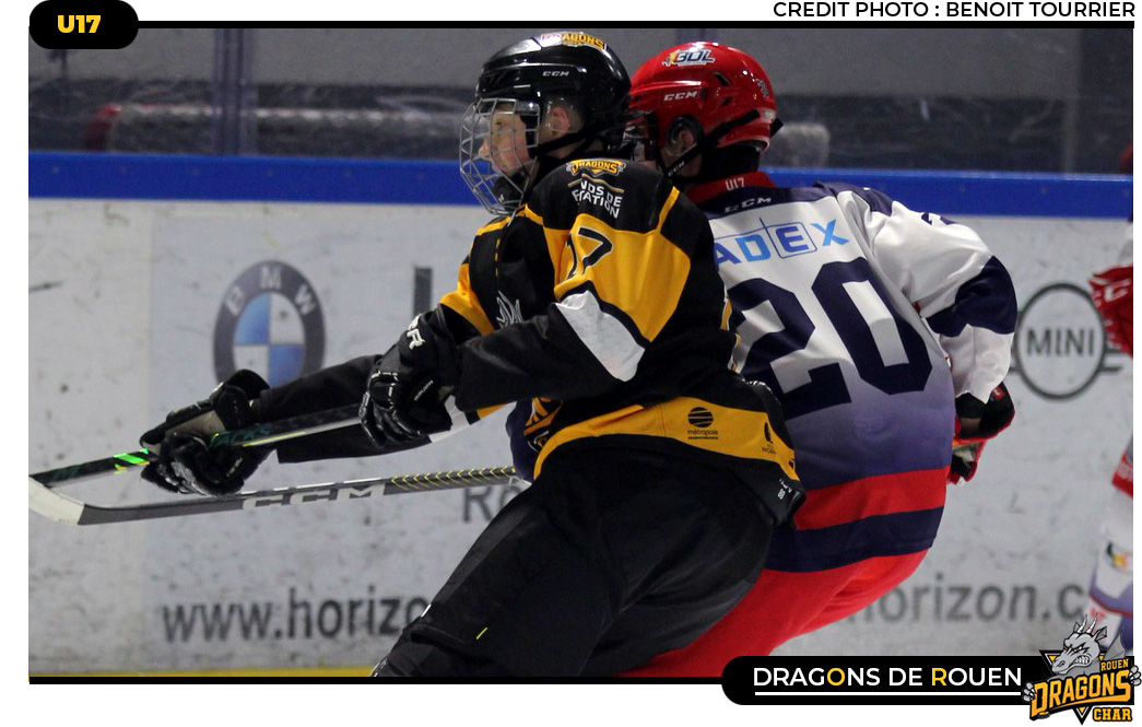 Pour autant, en dépit de la légitime déception vécue la veille, c'est avec sérieux que les Dragons réagiront dès le lendemain toujours face à Grenoble. Certes, les isérois étaient volontairement privés d'un bloc surclassé en U20 Elite, mais les rouennais aborderont cette partie avec un esprit plus conquérant. Les deux équipes besogneuses en défense, il faudra patienter jusqu'au cap de la mi-match pour voir le premier but de la rencontre. Cette fois, ce sont les Dragons qui se mettaient dans la lumière avec l'ouverture du score offerte aux jaune & noir par Léo Quemion. Alors que 7 secondes plus tard, Nathan Riu sommait les Dragons de ne pas trop s'enflammer avec l'égalisation à 1-1, dans le troisième tiers, les rouennais finiront par l'emporter grâce à un jeu de puissance efficace qui permettait à Noa Besson de donner la main aux Dragons avant que Nicolas Lechevallier ne peaufine le travail en marquant le but du 3-1 dans les deux dernières minutes de la partie. Victoire 3-1, dans un contexte différent qui n'efface pas le lourd & humiliant revers de la veille mais qui néanmoins redonne de l'élan au moment d'aborder les quarts de finale face à l'éternel rival amiénois.