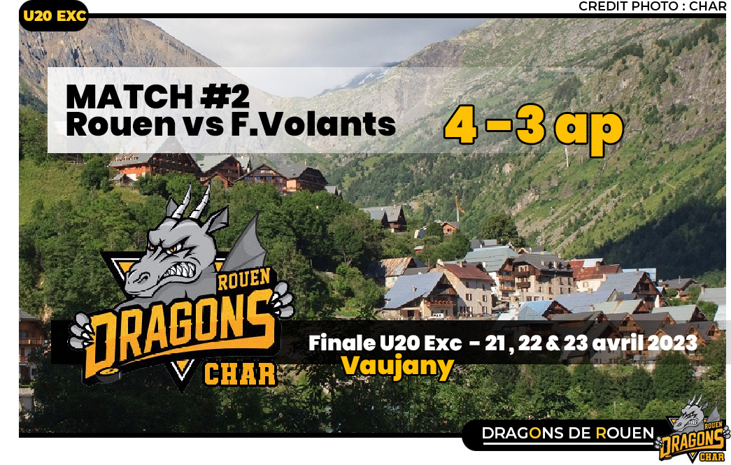 Pour la dernière journée du carré final U20 Excellence, les Dragons rouennais s'offriront une finale pour le titre face aux Brûleurs de Loups de Grenoble. Vainqueurs 4 à 3 après prolongation du futur ex-champion de France, les Normands enchaînent face aux Français Volants un deuxième succès après celui glâné la veille face à l'entente Angers / Cholet.