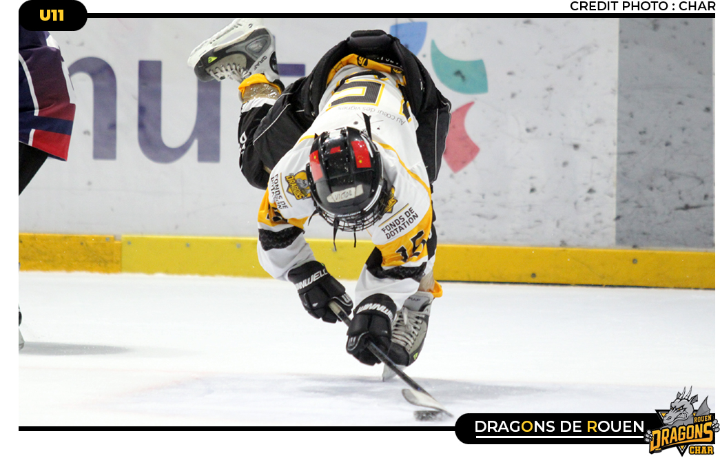 Se répondant à coup de « gros scores » Amiens Noir & Rouen Noir se livreront bataille à distance toute cette matinée de tournoi U11. Les uns, isérois, gesticulant face à Grenoble (7-2) & Caen (8-0), les autres, normands, s'évertuant à briller face à Cergy Vert (7-0) & Compiègne Bleu (13-2), un joli duel qui prendra toute son ampleur en début d'après-midi avec la confrontation directe entre les deux formations. En attendant, au bénéfice de leur succès 3 buts à 2 sur le troisième larron de tête Epinal, les Dragons de Rouen Noir se hissent provisoirement à la première place de la poule devant les spinaliens, les deux premiers bénéficiant d'un match supplémentaire sur Amiens Noir bloqué sur la troisième marche du podium. Derrière le trio de tête, entre Rouen 2012, Caen & Compiègne Bleu la lutte est sévère pour rester dans le sillage. Chez les Dragons de Rouen 2012, après un lourd revers concédé d'entrée de jeu face à Compiègne Bleu (7-3), le temps d'écarquiller les yeux, les rouennais auront retrouvé le sourire en arrachant un très beau match nul face à Grenoble (2-2) avant de s'incliner in extremis face à Caen (2-3)