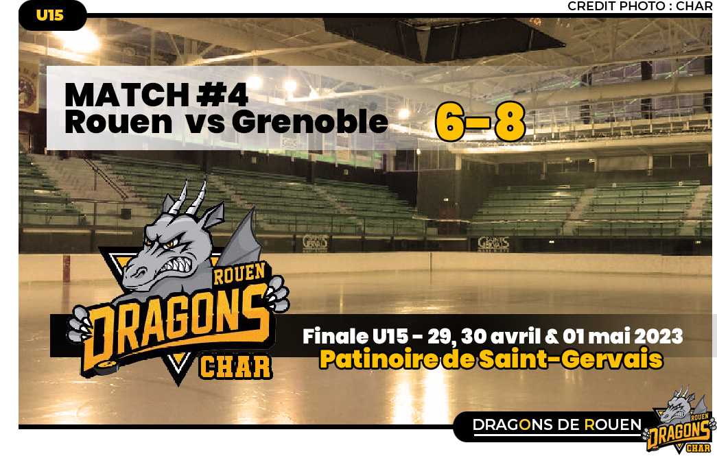 Sèchement battus 5 buts à 1 en match d'ouverture face aux Gothiques d'Amiens, les Dragons U15 pour espérer encore dans ce tournoi final U15 n'avaient d'autres alternatives que de « faire un résultat » face aux Brûleurs de Loups de Grenoble pour la deuxième journée. Hélas défaite 8-6 pour les Dragons avant le dernier rendez-vous face à Hockey 74 ce lundi avec une infime chance encore de décrocher une médaille à condition de faire sortir de la piste les Haut-Savoyards.