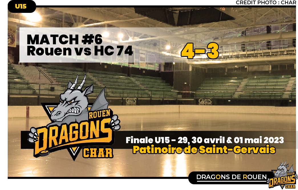 Grenoble, champion de France U15 2023, l'or désormais autour du cou des jeunes isérois, à l'occasion de la dernière rencontre entre Rouen & Hockey 74, il reste encore à remettre les médailles d'argent & de bronze, chacune des trois équipes restantes pouvant prétendre encore s'en emparer pour s'en parer à condition pour les Dragons de s'imposer par au moins quatre buts d'écart. En dépit d'une belle partie où les rouennais seront tout proches de renverser le match, seule la victoire sera au rendez-vous 3 buts à 4, une belle fierté déjà pour nos altiers rouennais.