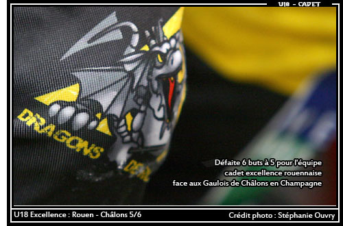 Avec un temps de présence de 16 minutes et 18 secondes sur la première période, William Legault, défenseur de Châlons en Champagne n'aura pas chômé durant la rencontre de Cadet Excellence disputée sur l'Ile Lacroix face aux Dragons. Ainsi, c'est au terme de sa première présence de 3 minutes 43 secondes que notre marathonien des glaces quittait la banquise rouennaise suite à l'ouverture du score d'Antoine Alexandra (03'43) Bien lancée, l'excellence rouennaise poursuivait son travail de sape devant la cage champardennaise par l'intermédiaire de Daniel Babka au rebond sur une déviation devant la cage d'Antoine Alexandra (10'02) Pour autant, bien que menée 2 buts à 0, Châlons en Champagne ne sera pas ridicule dans l'antre du Dragon. Sollicitant une première fois en break le portier rouennais Théophile Dereux par Lucas Cholet, les visiteurs du jour parviendront à égaliser avant la première sirène. En effet, si sur l'échappée précédente, le protecteur du filet jaune et noir se montrait vertueux, il ne pouvait rien faire dans la foulée sur la tentative de Alexandre Legault qui trouvait le petit filet pour la réduction du score (13'06) Vingt secondes plus tard, c'est un « centre tir » de Nathan Dutat dévié quasi derrière la cage par ce même Alexandre Legault qui offrait l'égalisation aux Châlonnais (13'26)